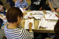 -> Group A: Went to the creativ workshop to Ibbenbueren KAJA-West to make "Origami out of steel". This workshop do a different large sized art projects, that came near the traffic road or roundabout traffic. The japanese group should help people who worked on this projekt to get an imagination how to fold an origami and also what kind of color pattern should be used.