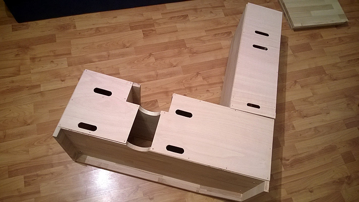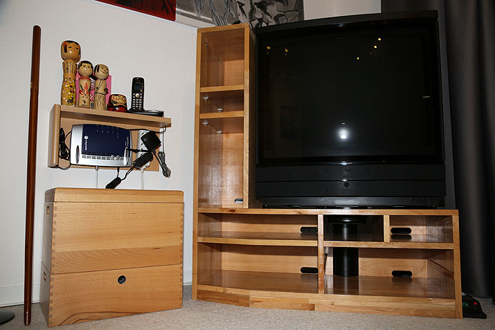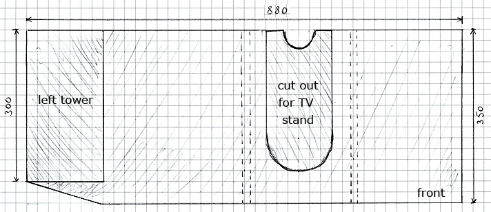 The main idea behind this, was to keep the TV at it original stand that can be rotate to any direction via remote. I imagined how I want to put each video game console in to a rack, because since PS2 (in Europe) there also a posibility to put the console verticaly. This would save some space horizontaly and its possible to make the rack more slim. This gave me the Idea to make the rack on one side going up to the top of a TV and make it look like an "L" letter. As for now, my TV stands at the room corner, but later I could put it between two book shelfs. It would also make a nice appearance this way!