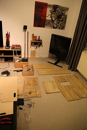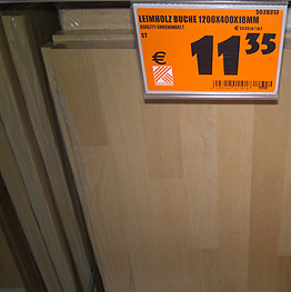 There would be obobviously a wood, but what kind of? The material has to be heavy and solid, because the left side of the TV-rack is going to be tall. If it would be made out of light material, it will be apparently unstable and you could easily tilt it or even throw it down. Also, I wanted to give it kind of the same look, as my other forniture in a room. Thats why i choosed bleech wood. Its really stable, heavy and solid sort of tree, but it also a hard to work with. Luckily, the DIY-Market, I got the material from, offered a cut service. Not for free but the price for a m3 was the cheapest there. Also I have no possibility to cut such a hard wood by myself.