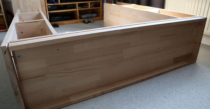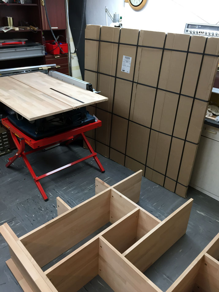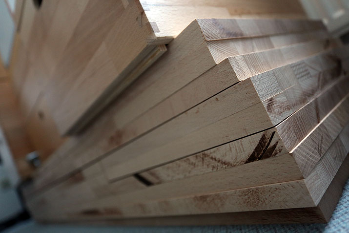 I got 1.2kW circular saw that can cut beech like butter. I need to cut of 1 to 2 mm of some edges to make whole construction fit perfectly again. It was kind of a pain in the a**, cause I drilled already almost all boreholes for the dowels. Now I have to put them 1 to 2 mm deeper in to the boards so they can still clamp.