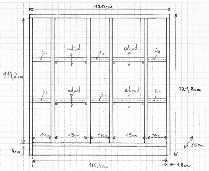 Excuse my inacurate scale on this one. The width of the center section should match the outer one. I did some other designs, but ended up with this as my final one. Here you can store heavy LaserDiscs in 17 cm sections while placing some LPs in 29 cm by adding some additional stages. 48 cm section can take audio systems, LP Player or LD Player. Or just cram that badboy full with LD&LPs.